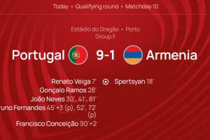 此外,这也是葡萄牙历史上对亚美尼亚的最大比分胜利,此前纪录为5-0