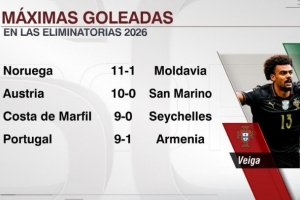 这也是在2026年世界杯预选赛第四大分差胜利,前三位分别是挪威11-1摩尔多瓦、奥地利10-0圣马力诺、科特迪瓦9-0塞舌尔。
